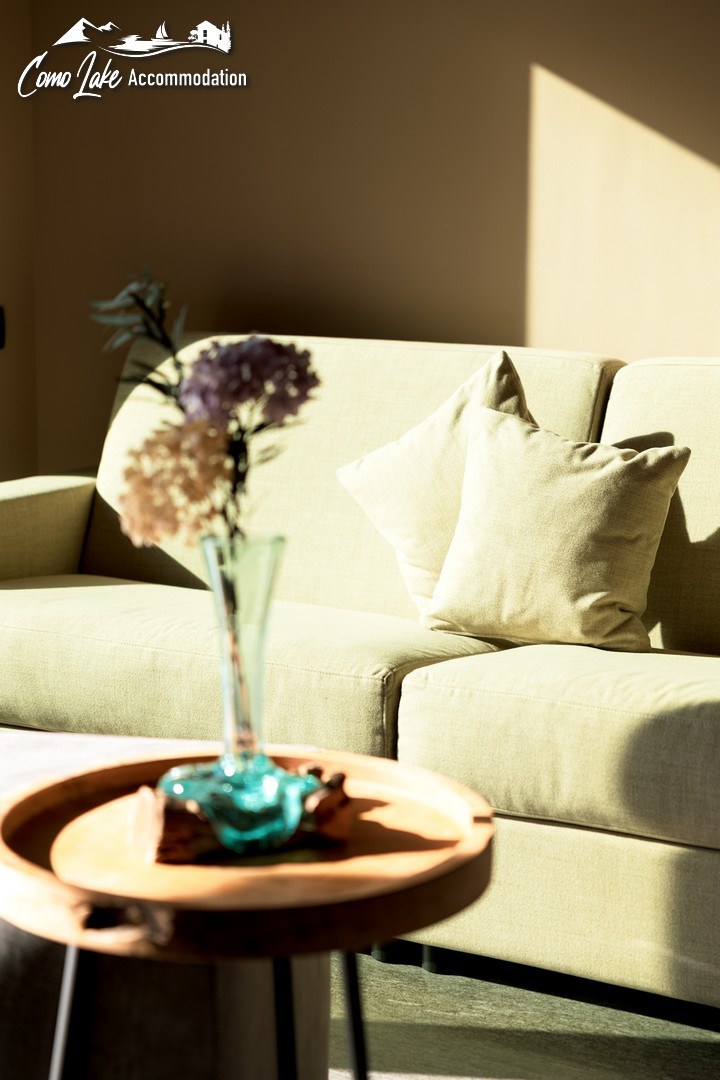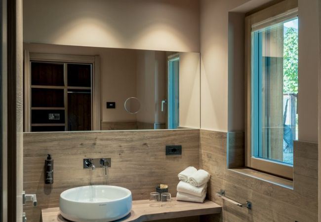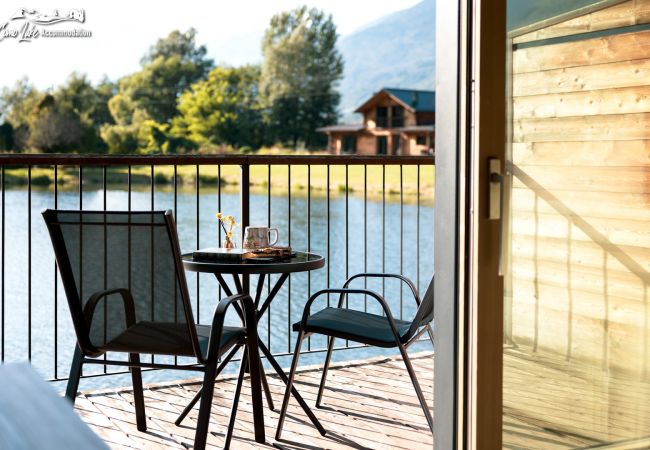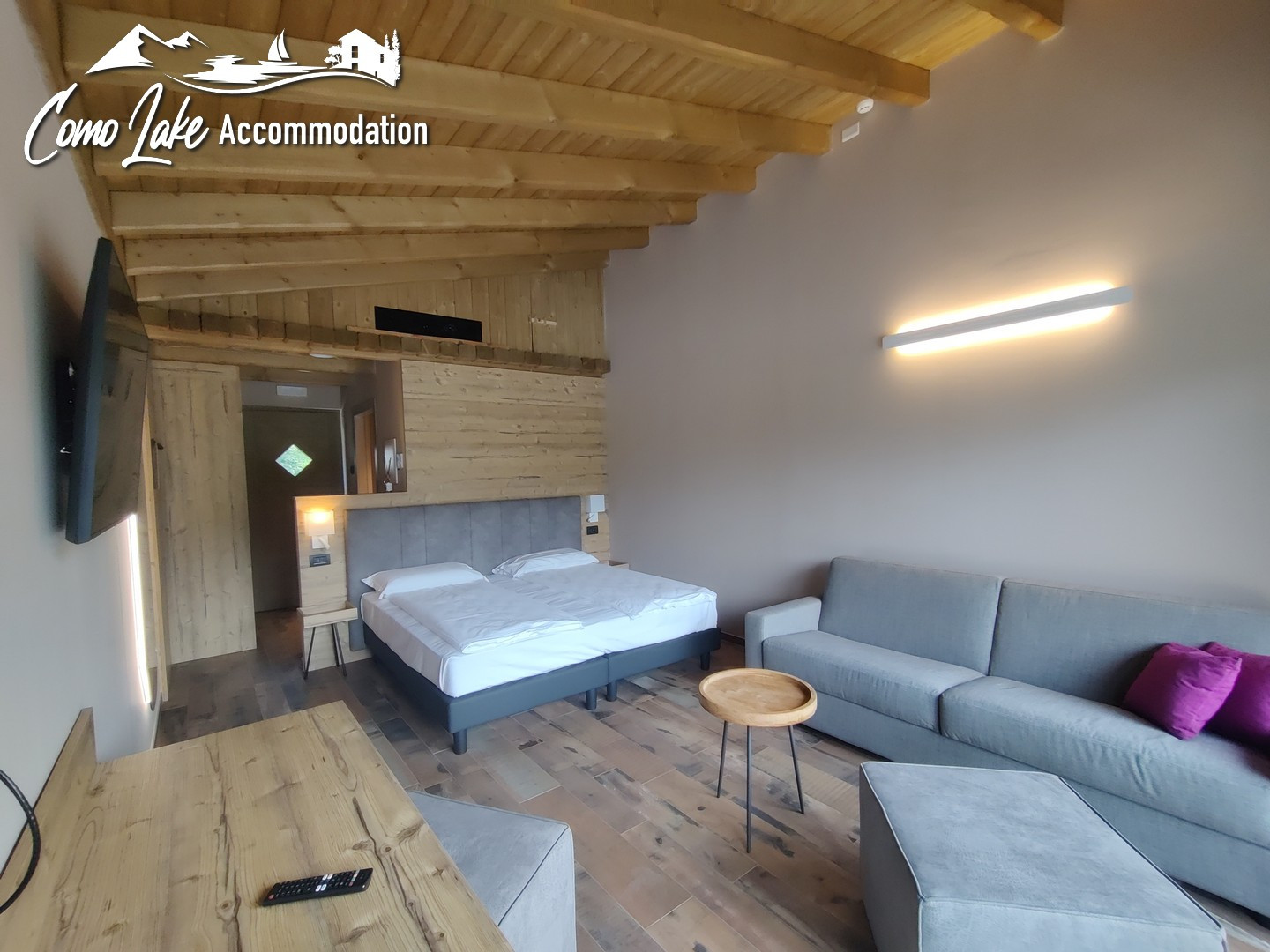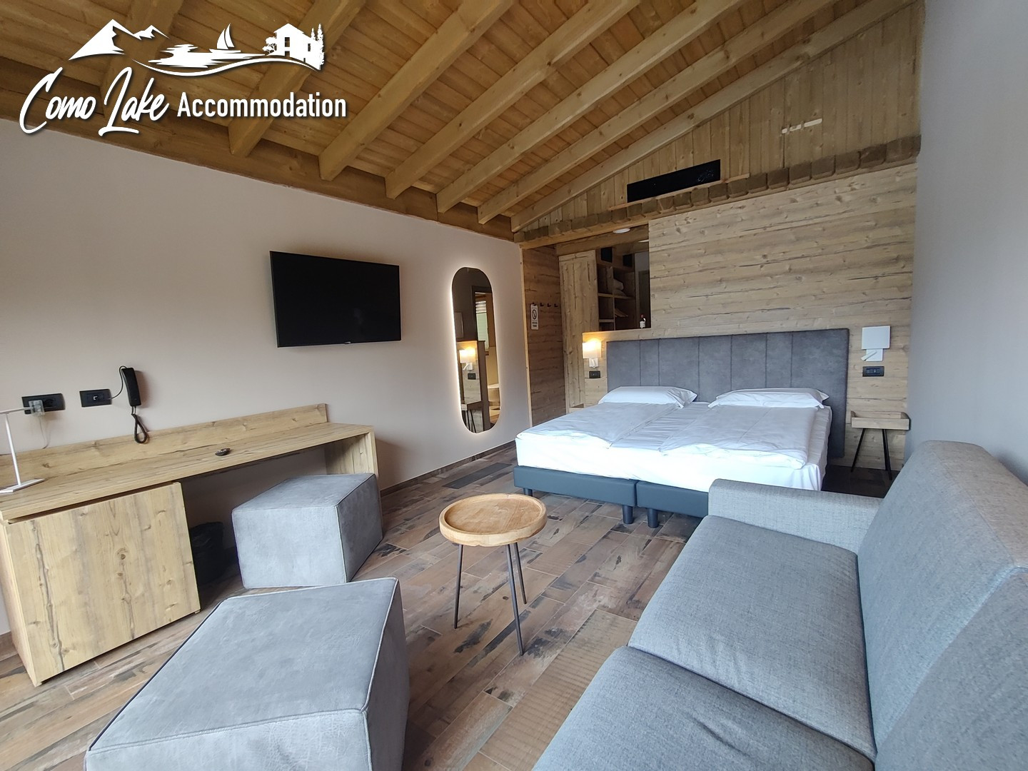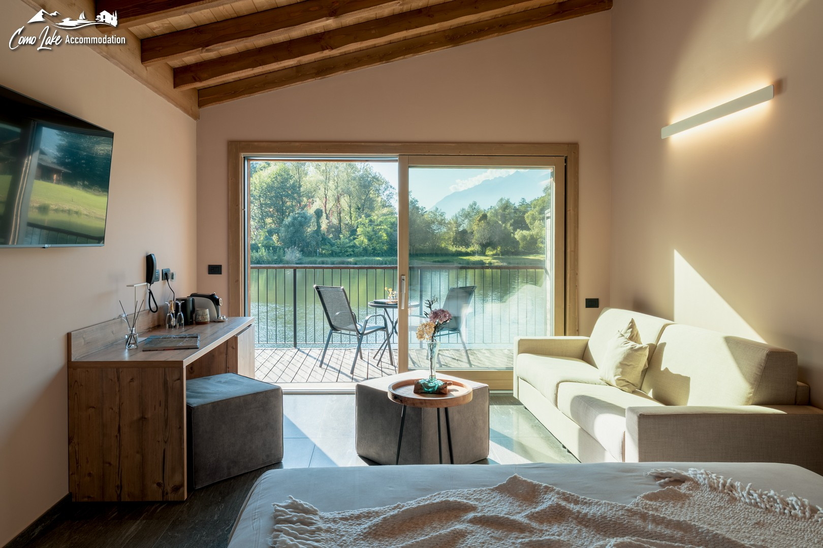 La camera vanta una meravigliosa vista lago e montagna, con un balcone privato che permette di immergersi completamente nel paesaggio circostante. L'ampio spazio interno è arredato con gusto, con un letto king size che garantisce il massimo comfort e un divano doppio per momenti di relax.