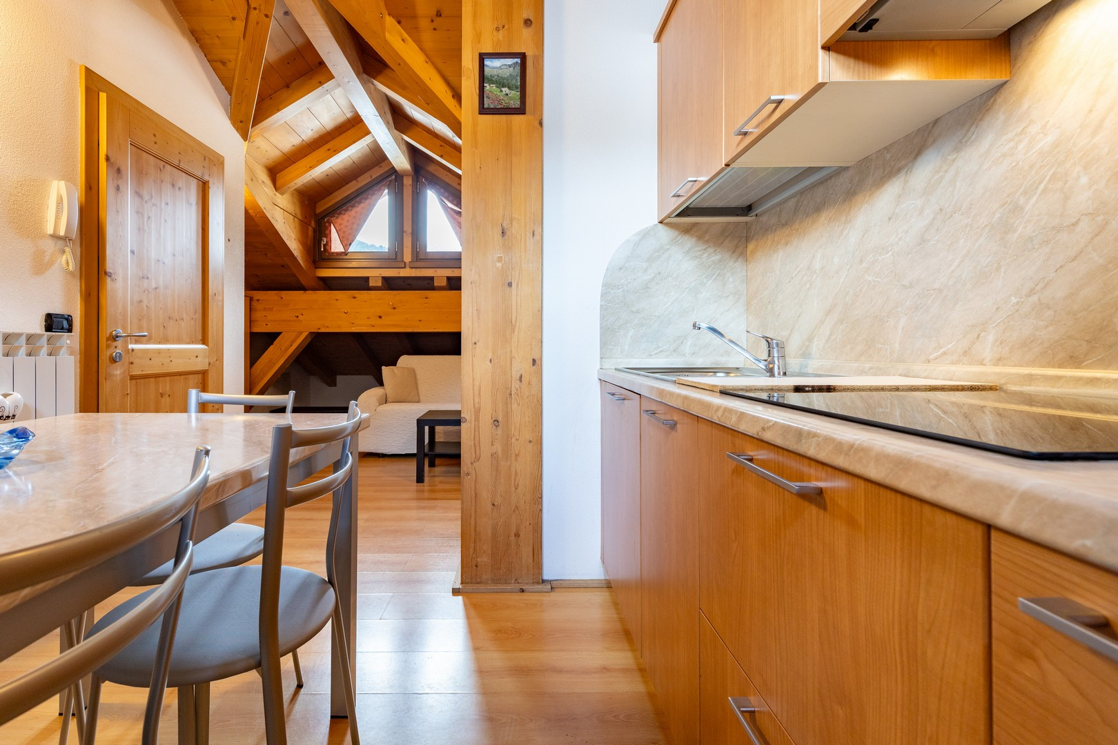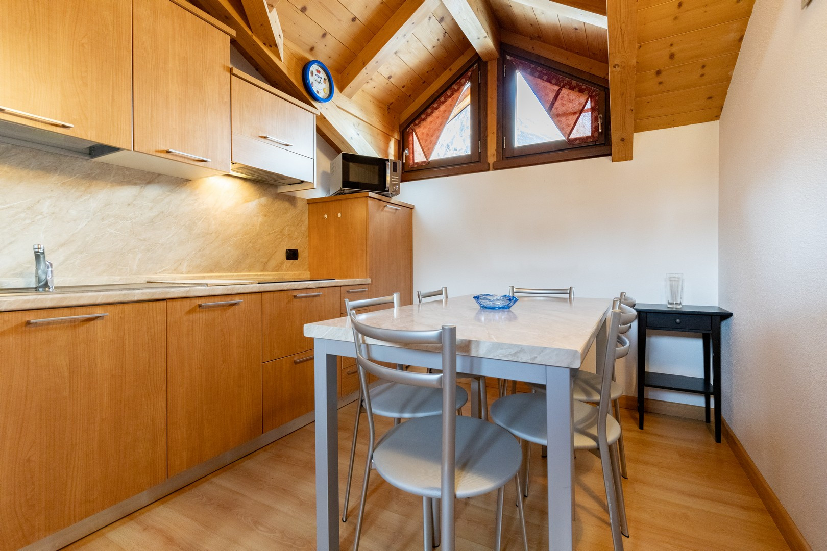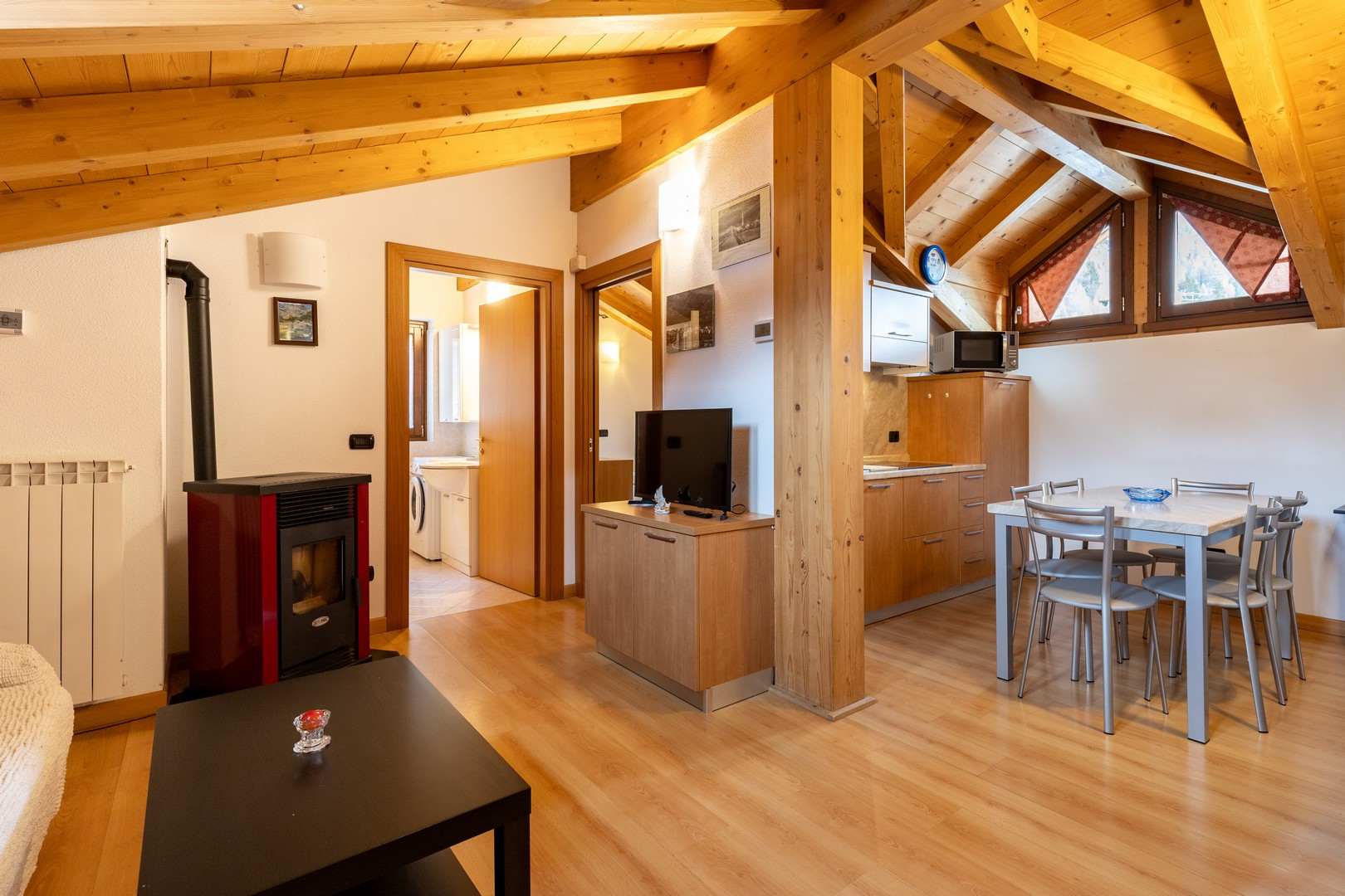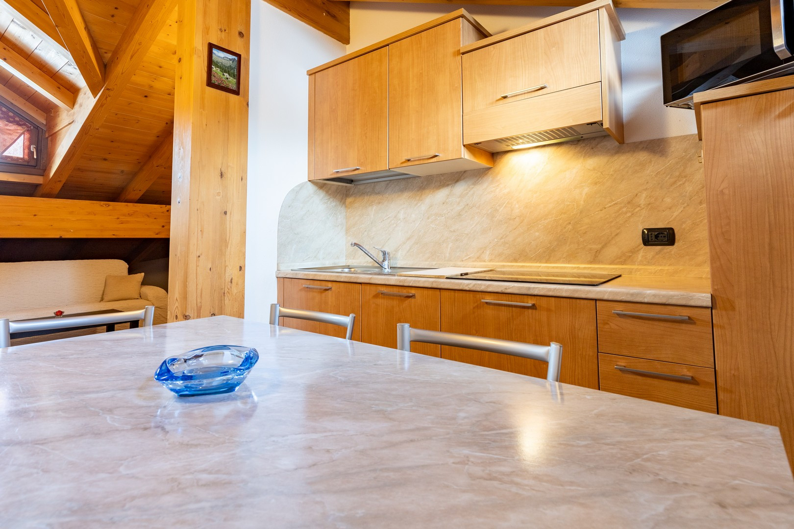 La cucina, completamente attrezzata, è un vero gioiello per gli amanti della gastronomia. Dotata di frigorifero, lavastoviglie, macchina da caffè, microonde e tutti gli utensili necessari, permette di preparare deliziosi pasti insieme, condividendo momenti di intimità culinaria.